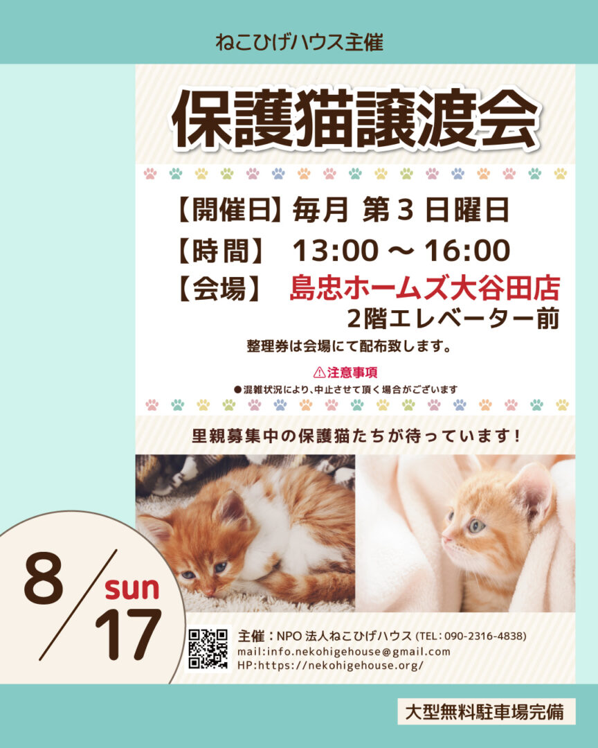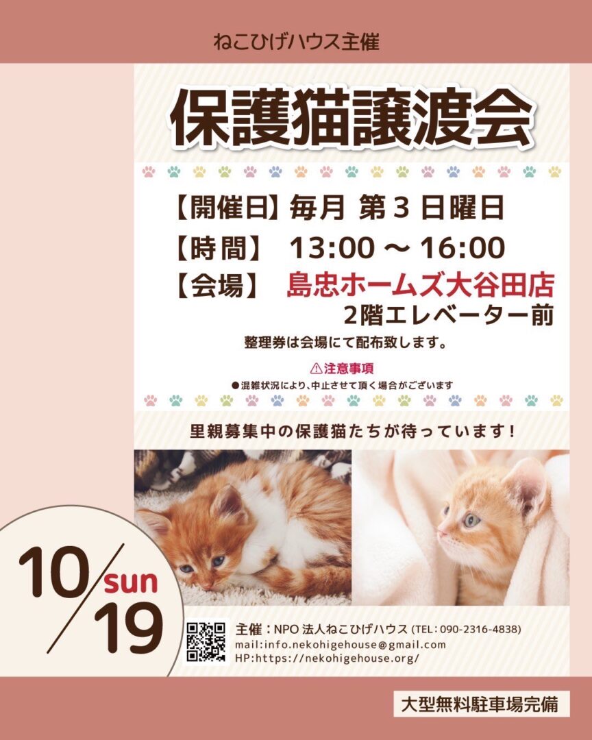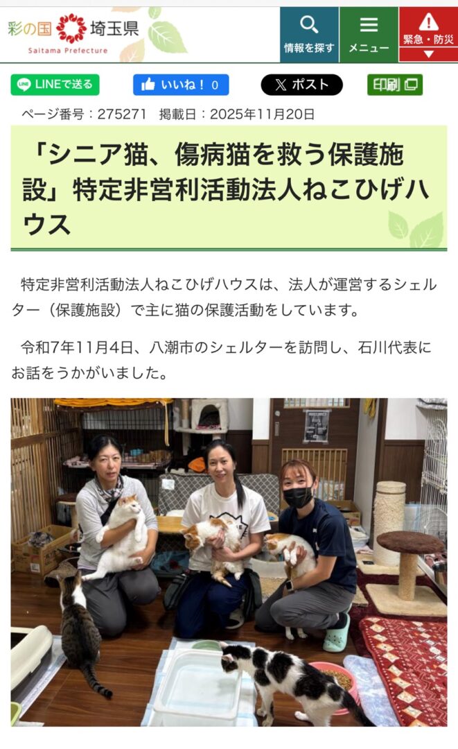 現在(2019年)は飼育困難となったシェルターとしての一軒家の猫およそ110匹を「ねこひげハウス」が引き取り保護犬2匹と共に維持管理しています。里親探しを初め、病気の猫の看病、看取り、毎日の掃除や管理、とてもとても大変です。