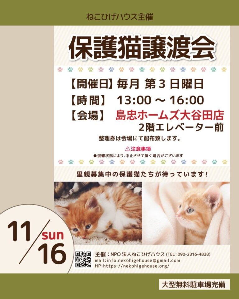 ⚫︎譲渡会に参加する猫たちは、ねこひげハウスのSNSでお知らせを出させていただきます。