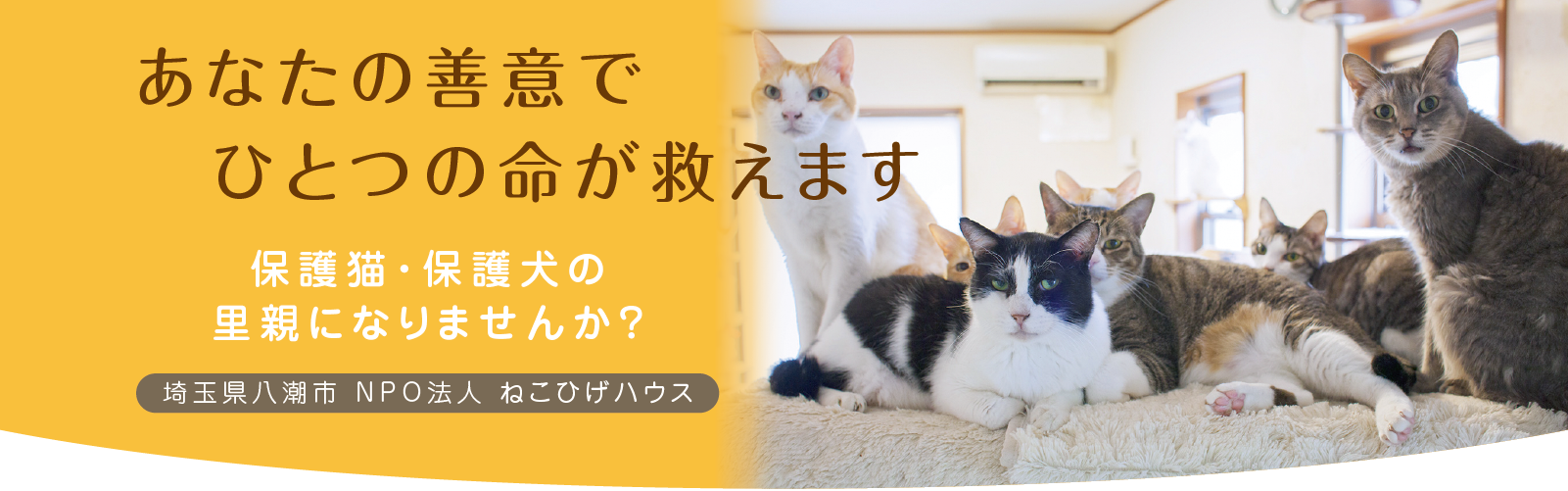 現在(2019年)は飼育困難となったシェルターとしての一軒家の猫およそ110匹を「ねこひげハウス」が引き取り保護犬2匹と共に維持管理しています。里親探しを初め、病気の猫の看病、看取り、毎日の掃除や管理、とてもとても大変です。
